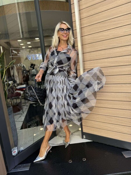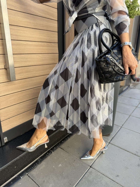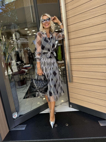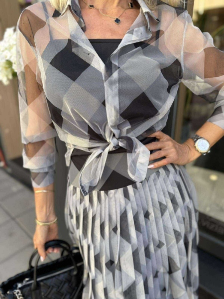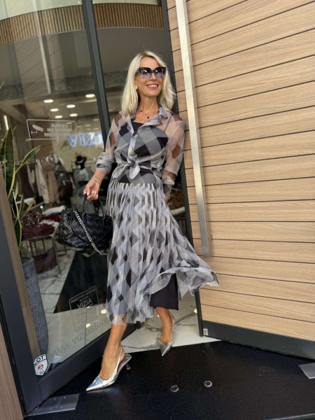 Комплект от две части в сиво и черно. Горната част е риза и има подплата. Полата е солей и се закопчава със страничен цип.