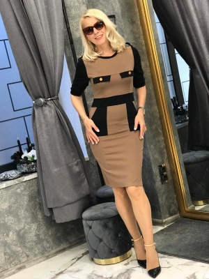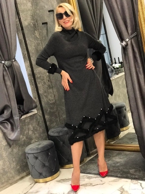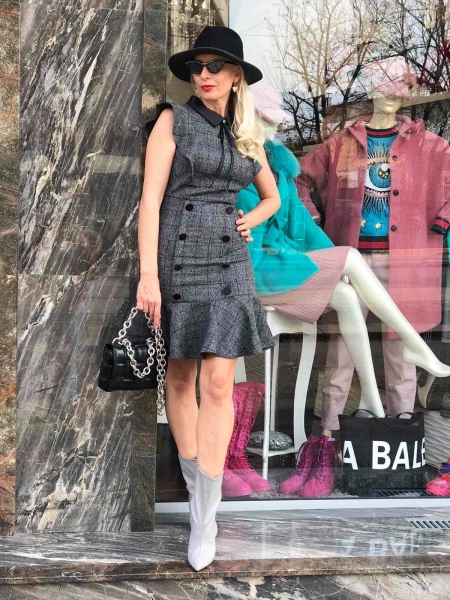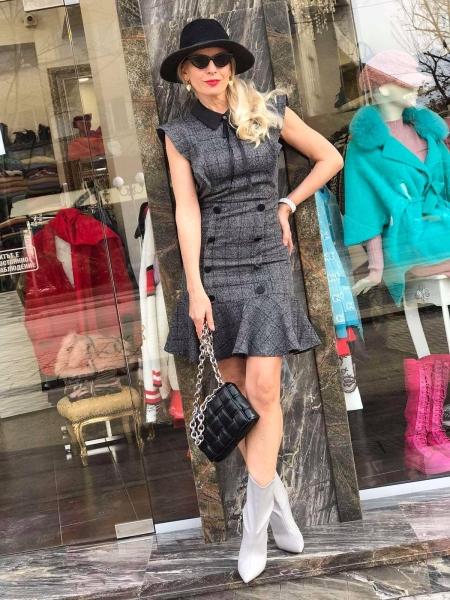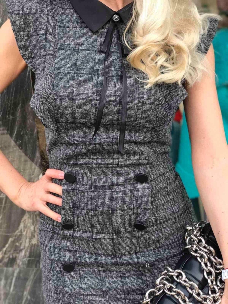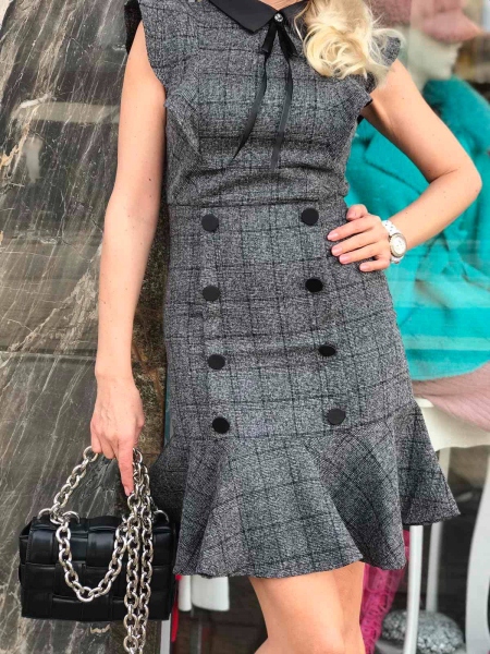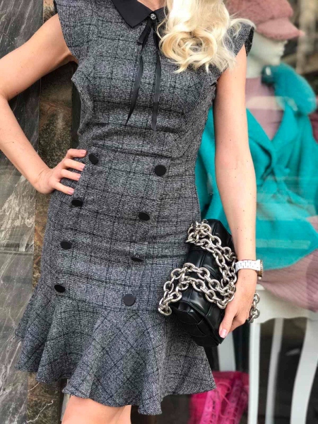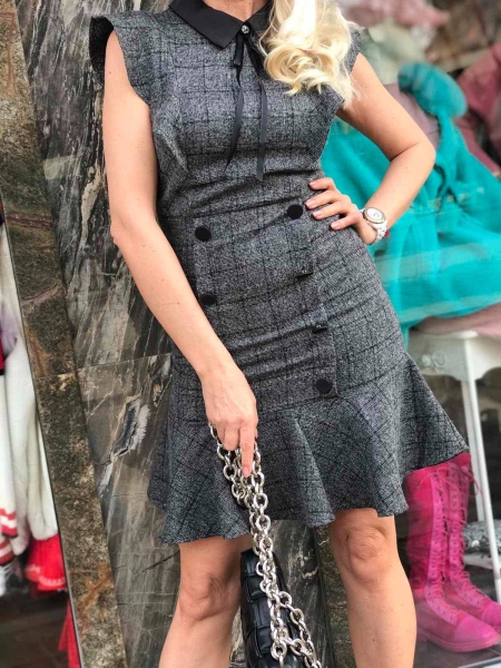Къса рокля в сиво с яка.Модела е с втален силует и се закопчава с цип на гърба.