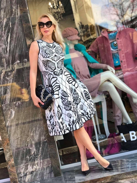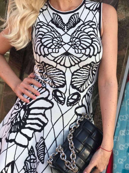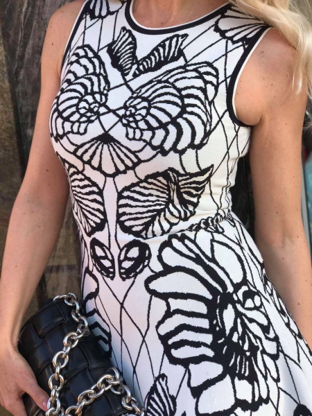 Рокля в бало и черно  от бандажна материя .Модела е с втален силует и с разкроена долна част.Роклята е без закопчаване.