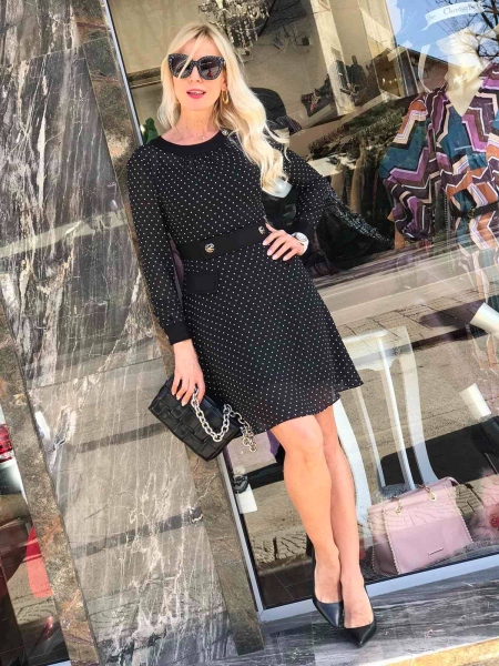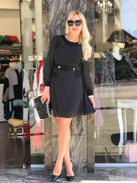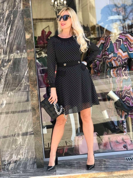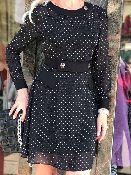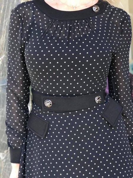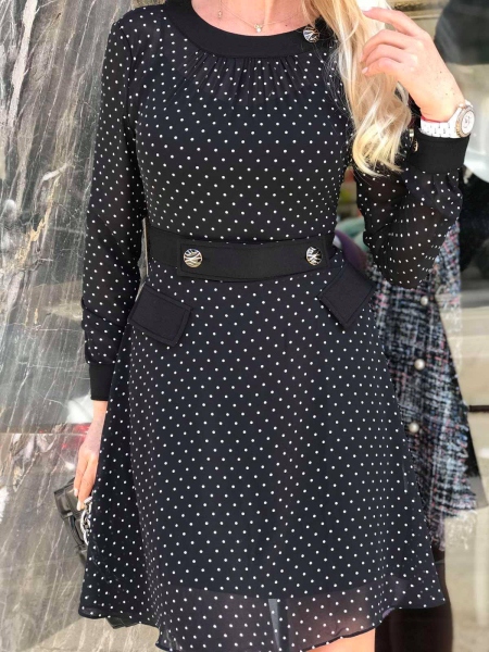 Черна рокля от тънка материя с десен от бели точки.Модела е с шев на талията и се закопчава с цип.Има декорирани копчета на талията и деколтето.
