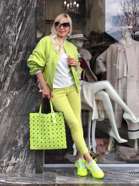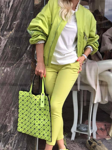 Панталон в ярко зелен цвят със втален силует по тялото.Модела е с дължина до глезена и има странични джобове и гайки за колан.Самата материя има и еластичност.