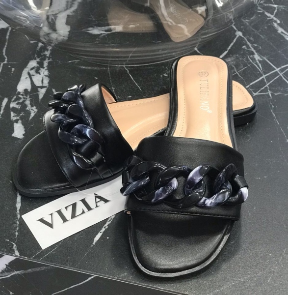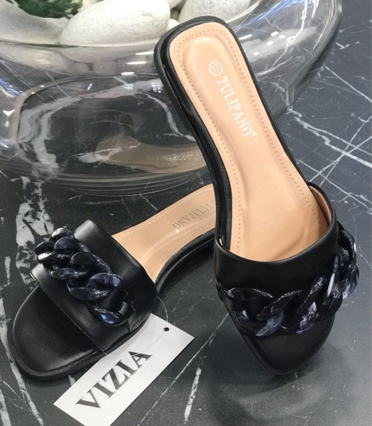 Чехли с равна подметка в черен цвят.Модела е от еко кожа и е декориран в горната част със синджир.