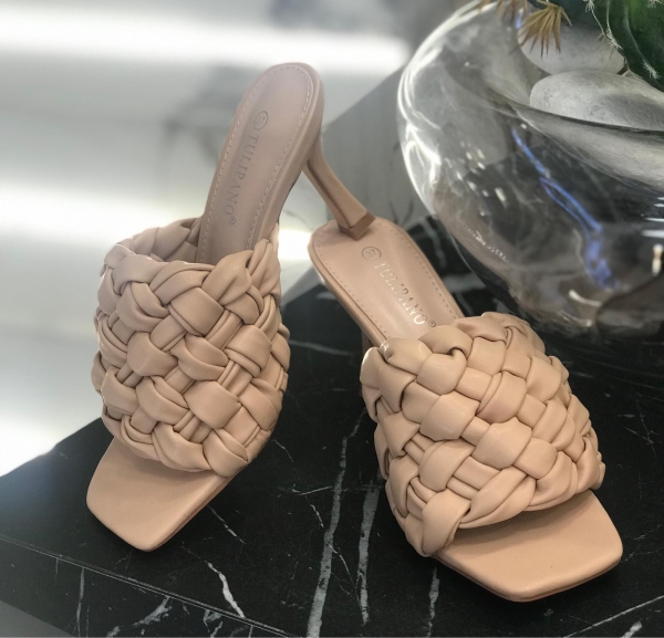 Чехли на висок ток в бежов цвят.Модела е от еко кожа.Височина на тока 8,5 см.