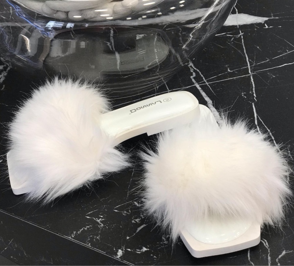 Чехли с равна подметка в бял цвят.В горната част са декорирани с еко косъм.