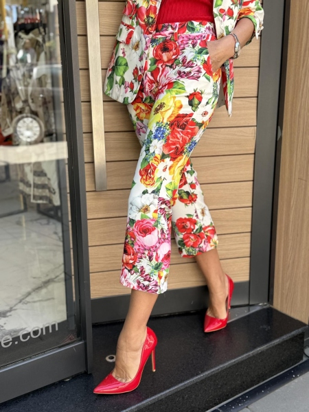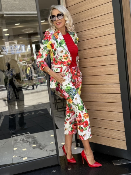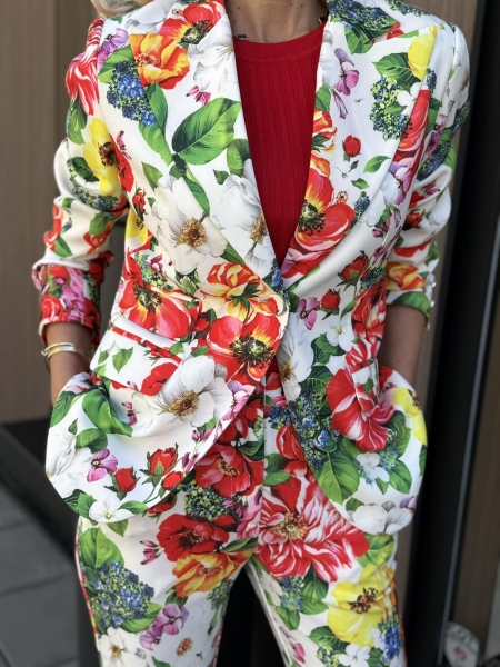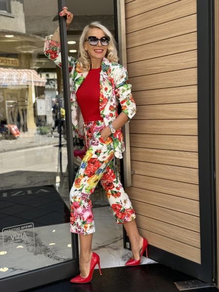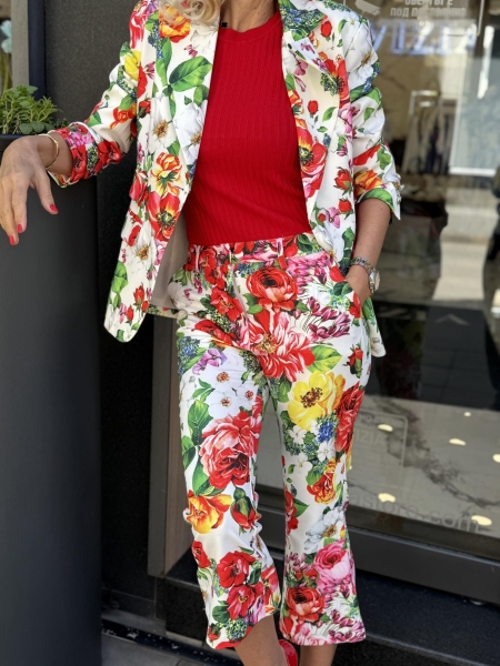 Комплект сако и панталон с флорален десен. Панталонът е със 7/8 дължина, закопчаване с цип и копе. Сакото е с втален силует, ревери и закопчаване с копче.