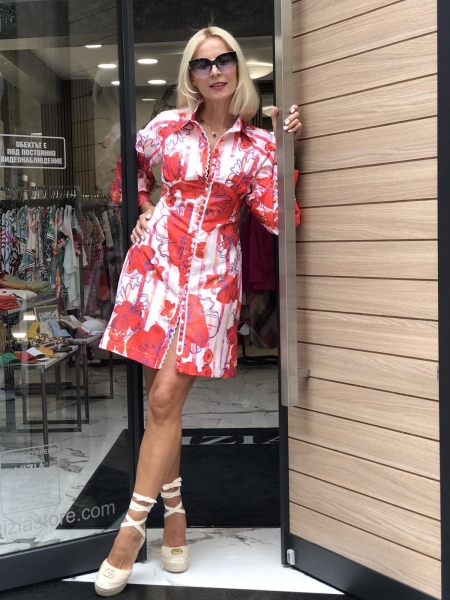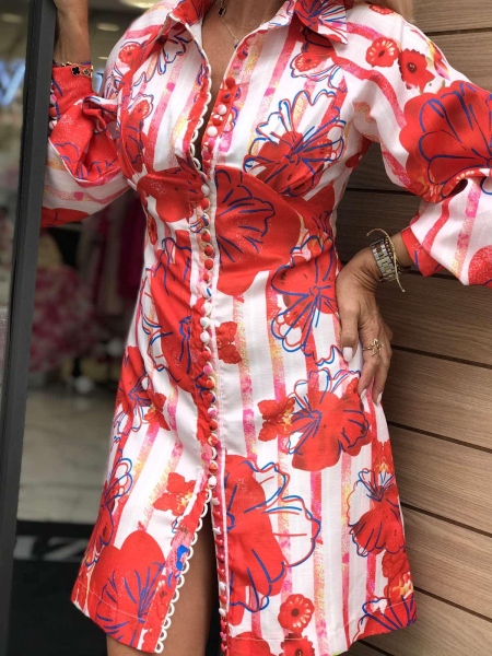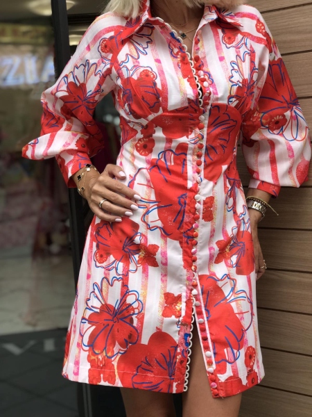 Къса рокля с втален силует . Моделът е с дълъг ръкав и се закопчава с копчета.