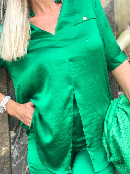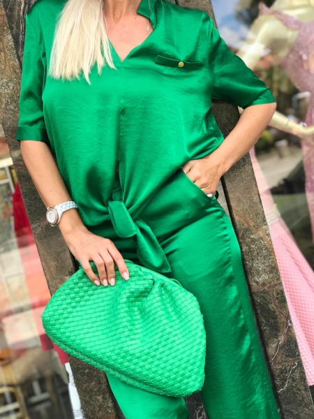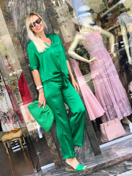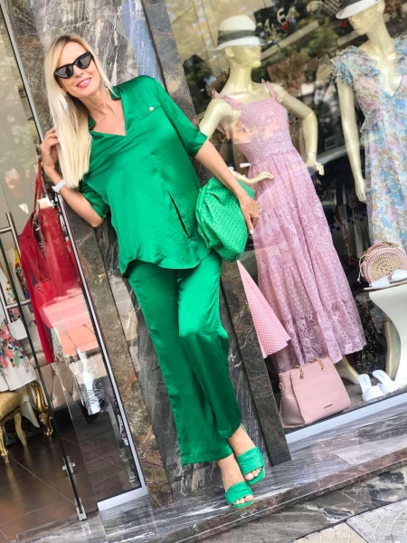 Комплект от сатенена материя в ярко зелен цвят.Ризата е свободен силует,панталона е с висока талия и свободни крачоли.