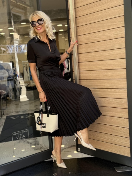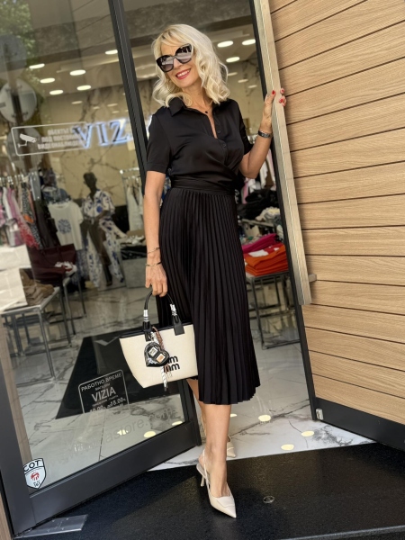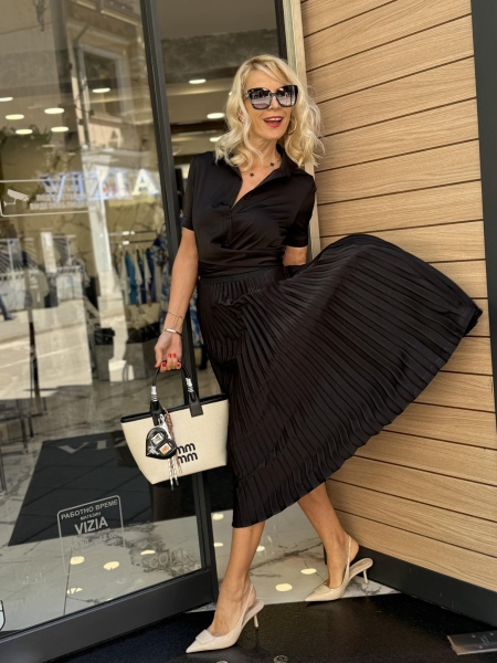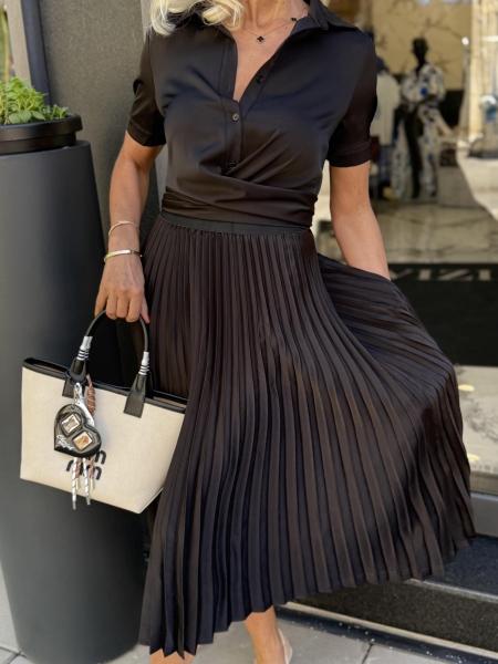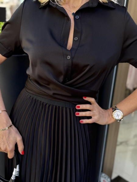 Рокля в черно от сатенирана материя с къс ръкав. Горната част е тип риза с яка и копчета, долната част е солей и има в предната част на талията ластик.