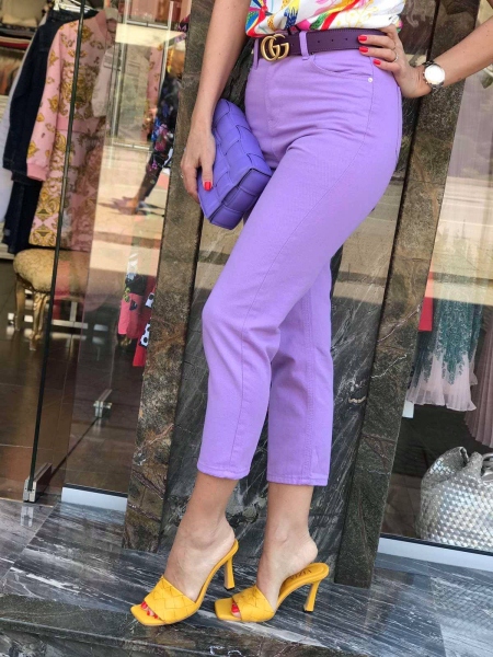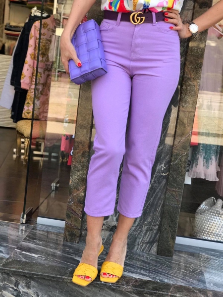 Панталон с висока талия от деним. Моделът е по тялото и се закопчава с цип и копче.
