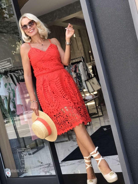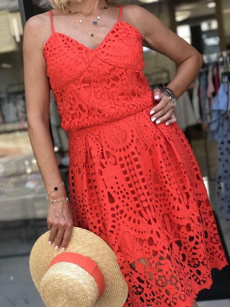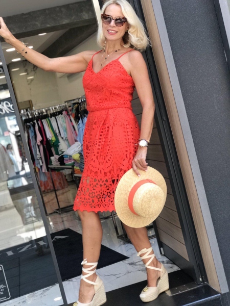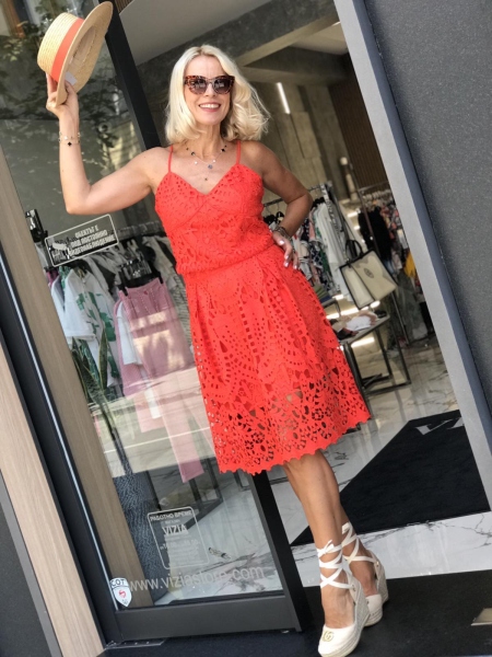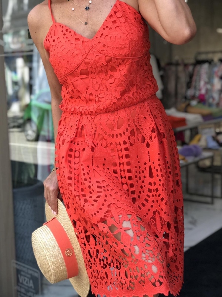 Сет от едра дантела в наситено оранжев цвят.Горната част е по-скъсена и се закопчава с цип на гърба.Полата е с висока талия и се закопчава с цип.