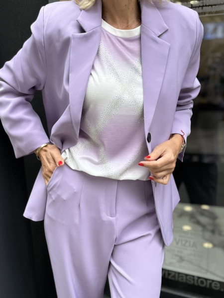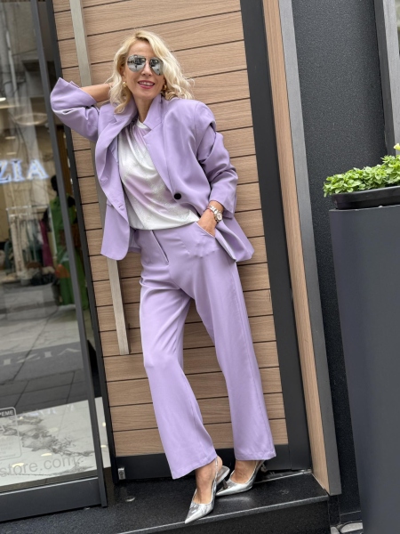 Комплект в бледо лилав цвят с изчистен дизайн. Сакото е без вталяване със свободен силует. Панталонът е с висока талия и свободни крачоли.