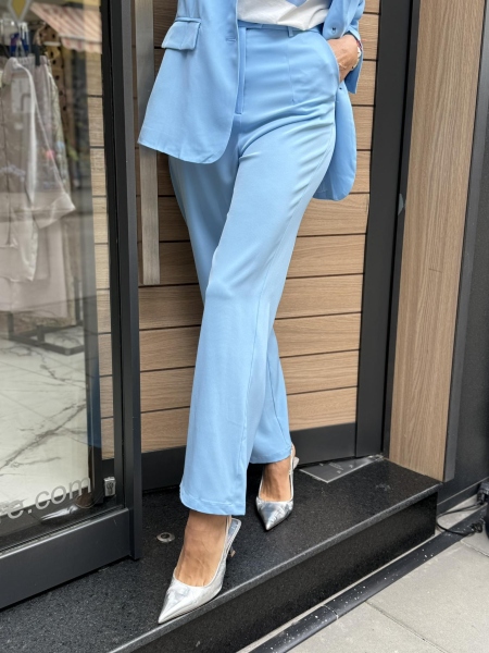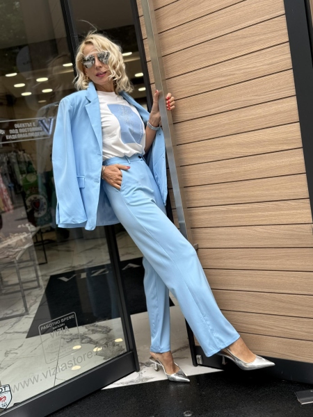 Комплект в светло син цвят с изчистен дизайн. Сакото е без вталяване със свободен силует. Панталонът е с висока талия и свободни крачоли.