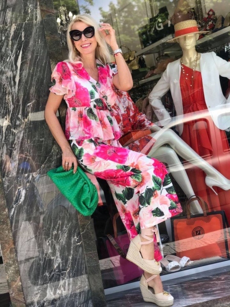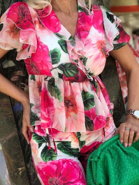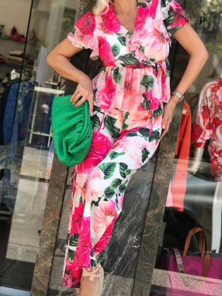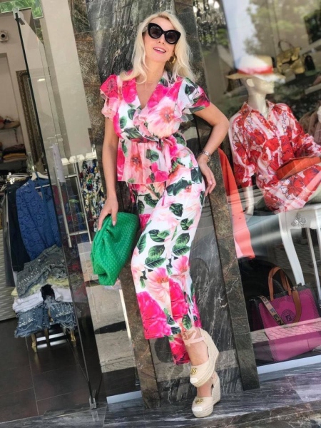 Комплект с флорален десен от тунка материя.Горната част е скъсен топ модел "прегърни ме".Панталона е с висока талия и свободни крачоли.