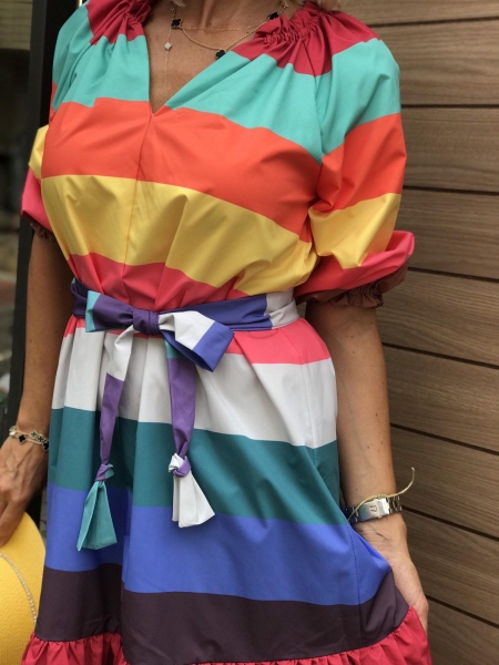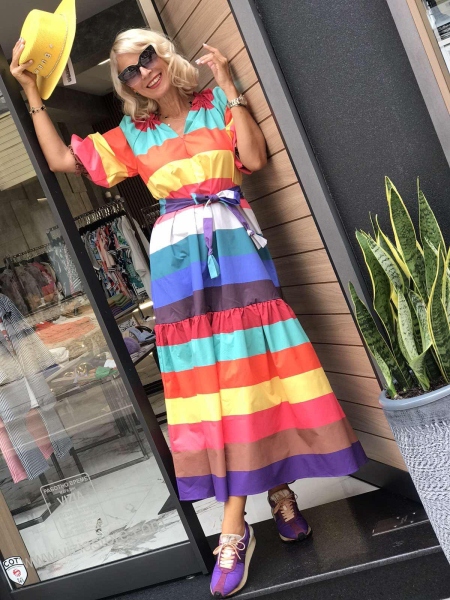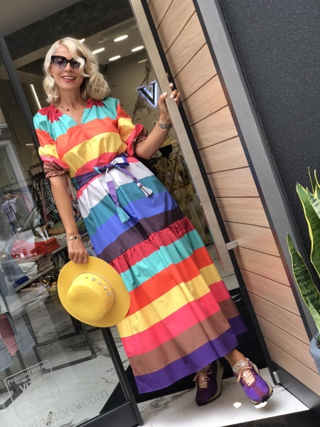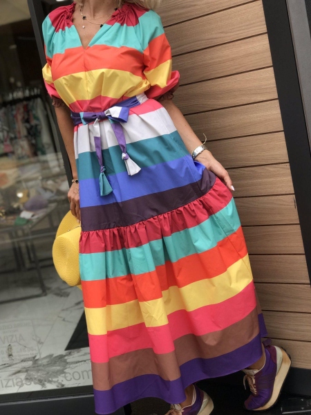 Дълга рокля със свободен силует в пъстри цветове.Модела е без закопчаване.