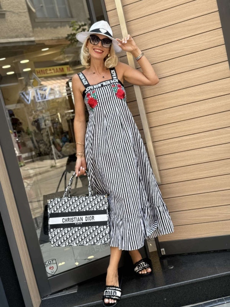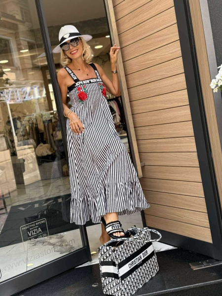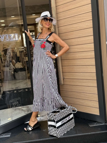 Дълга рокля с раиран десен и свободна кройка. Моделът се закопчава с цип.