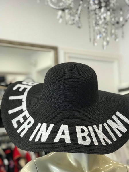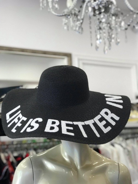 Шапка от сламена материя в черен цвят с голяма периферия.