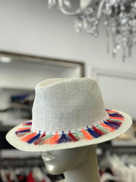 Шапка от сламена материя в светло бежов цвят. Модела е декориран с цветни мотиви около периферията. С възможност за стесняване.