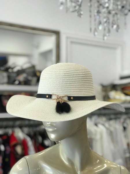 Шапка в натурален цвят с голяма периферия. С възможност за стесняване.
