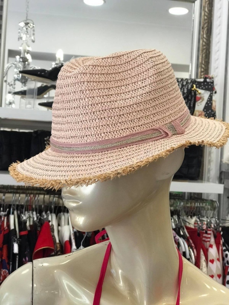 Шапка от сламена материя в бледо розов цвят с блестяща лента.