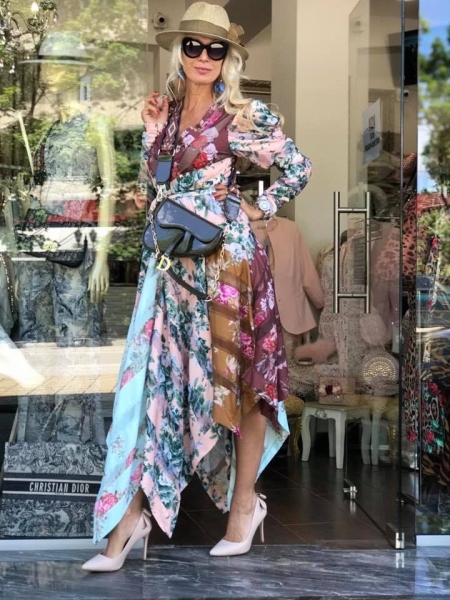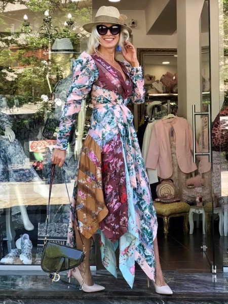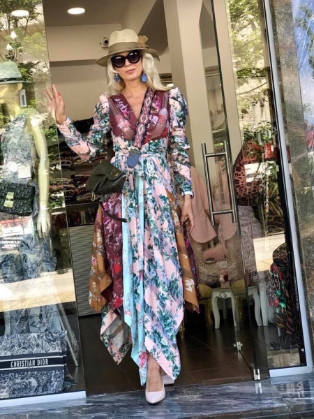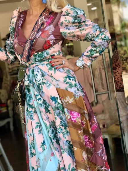 Дълга рокля с цветни мотиви.С остро деколте,шев на талията и буфан ръкав.С подплата.