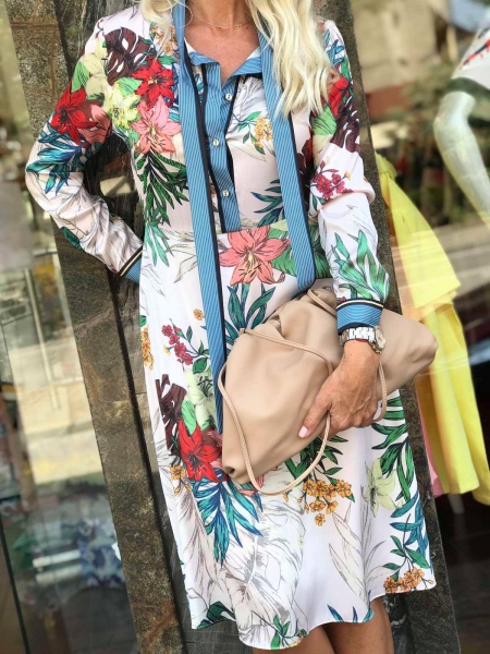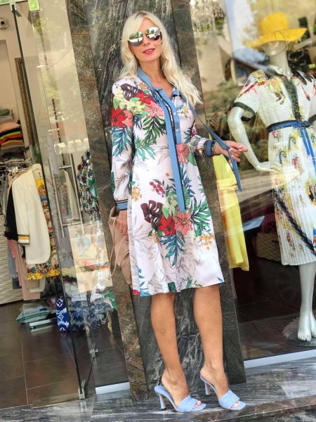 Рокля с дълъг ръкав от сатенирана плат с флорален десен. Моделът е с шев на талията и се закопчава със страничен цип.