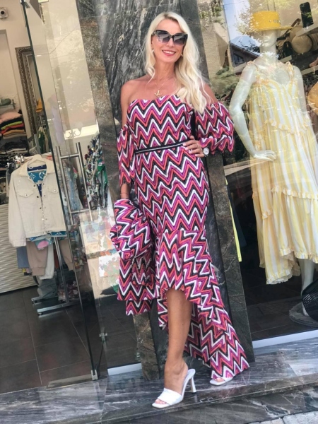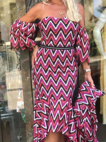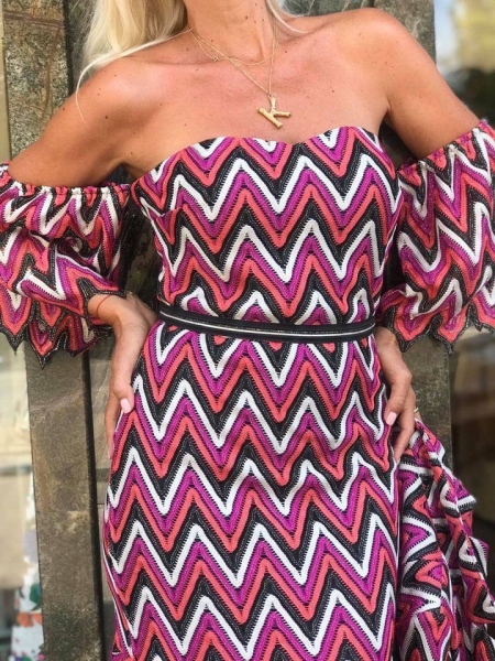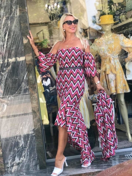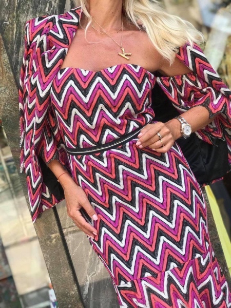 Рокля с втален силует в цветни нюанси. Моделът е с шев на талията и се закопчава с цип на гърба.