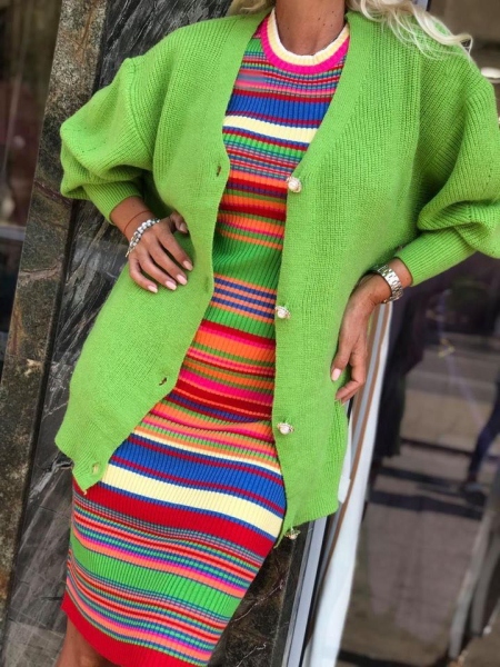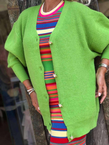 Жилетка от плетиво със свободен силует. Моделът се закопчава с копчета. Размерът е универсален и е подходящ за S, M, L.