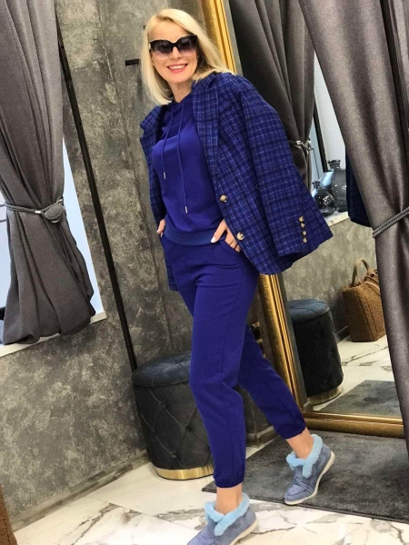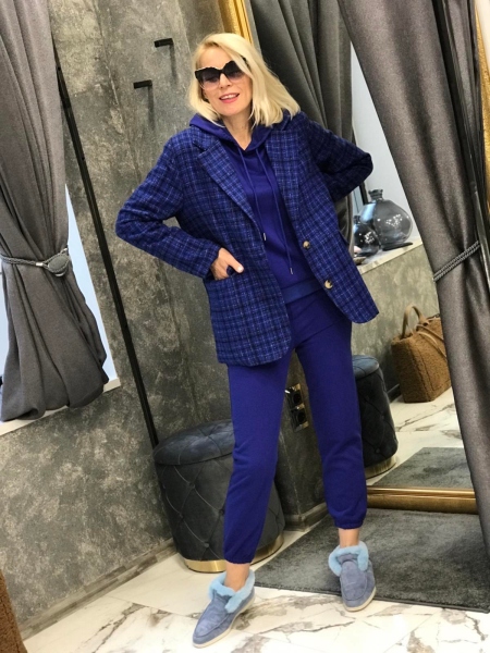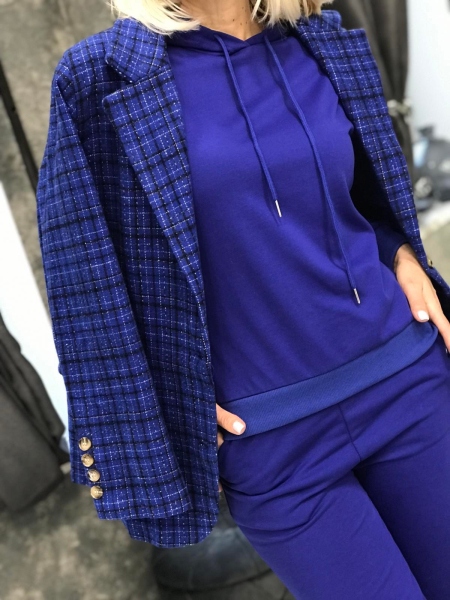 Ежедневен комплект от три части. Сакото е със свободен силует и се закопчава с копчета. Суитчерът е с качулка и е без закопчаване. Панталонът е на ластик в талията и краищата на крачолите.