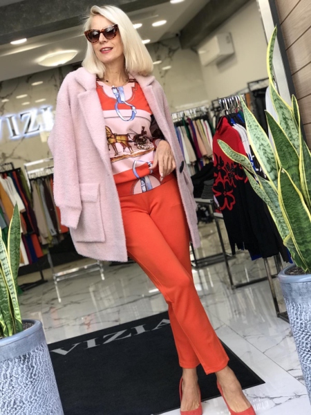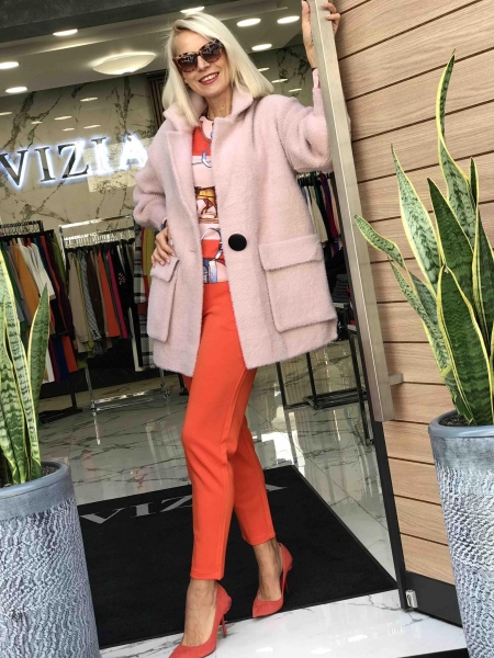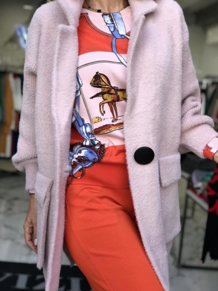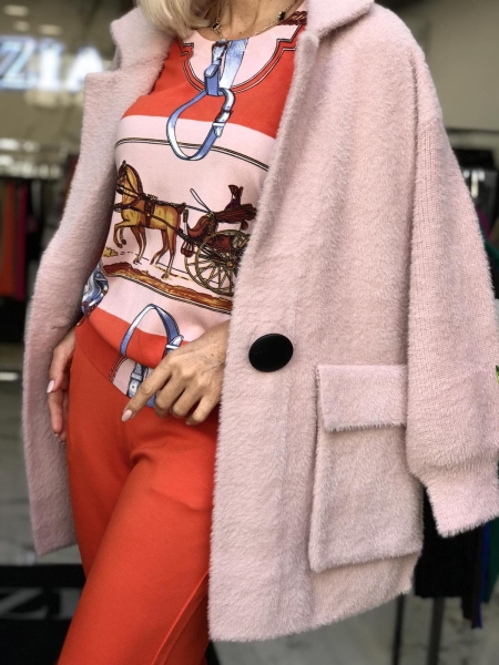 Жилетка от мека материя в светло розов цвят. Моделът е със свободен силует и се закопчава с едно копче. Размерът е универсален и е подходящ за S, M, L.