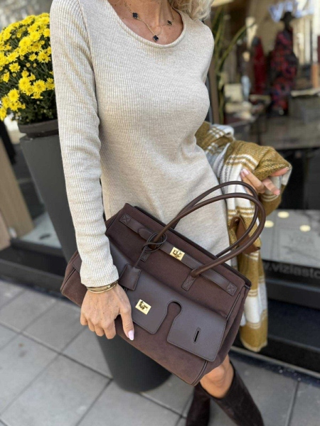 Комплект в бежови нюанси от две части. Роклята е от фино плетиво и е с втален силует. Горната част е тип манто с кариран десен и е без закопчаване.