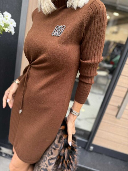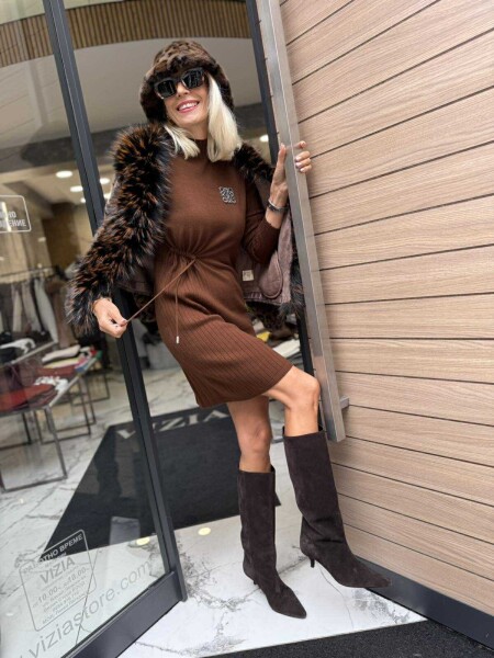 Рокля в тъмно кафяв цвят от плетиво. Моделът е с втален силует и ниско столче яка. Размерът е универсален и е подходящ за S,M.