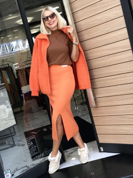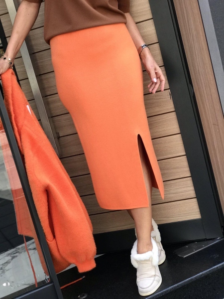 Пола по тялото с дължина под коляното от мека кашмирена материя. Моделът е с ластик в талията и в предната част е с цепка. Размерът е универсален и е подходящ за S, M, L.