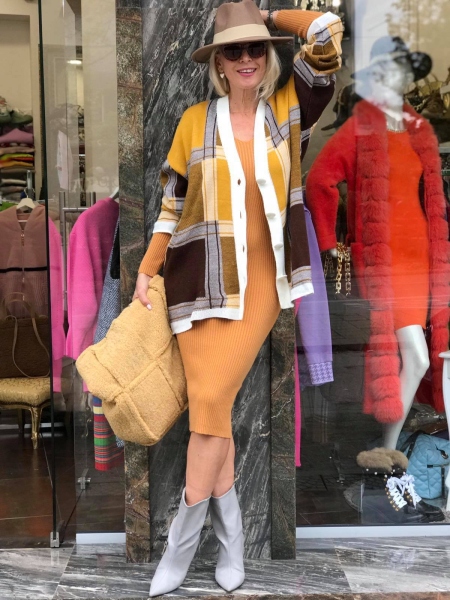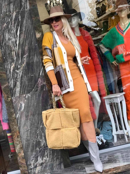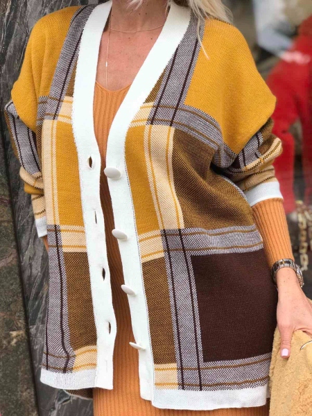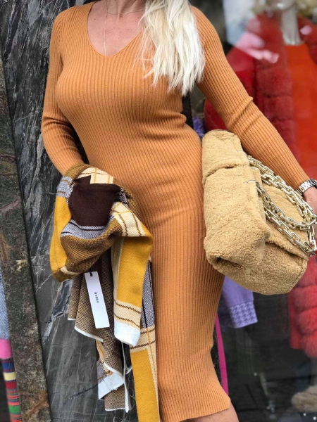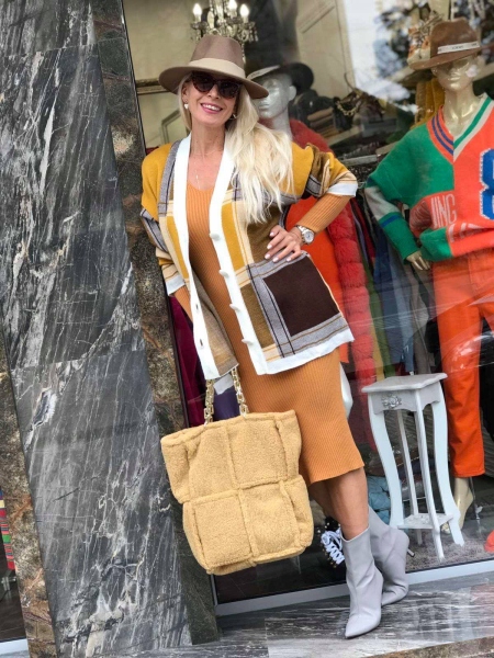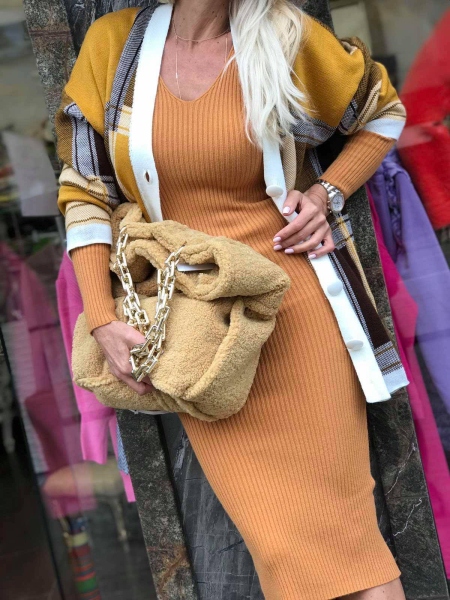 Комплект рокля с жилетка от фино плетиво. Роклята е с втален силует по тялото. Жилетката е със свободен силует и се закопчава с копчета.