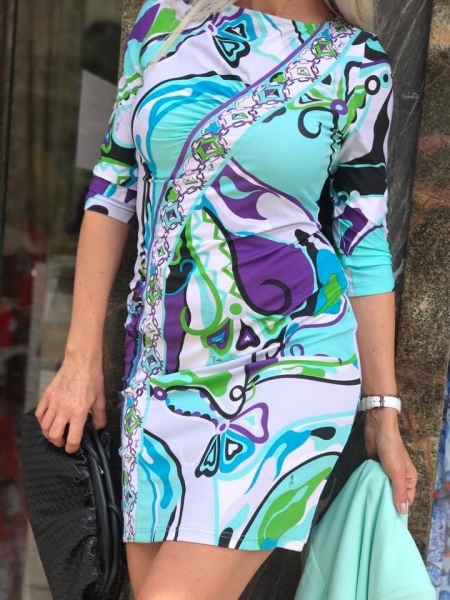 Къса рокля с кройка по тялото.Ръкава е 7/8,Материята има еластан.Без подплата.