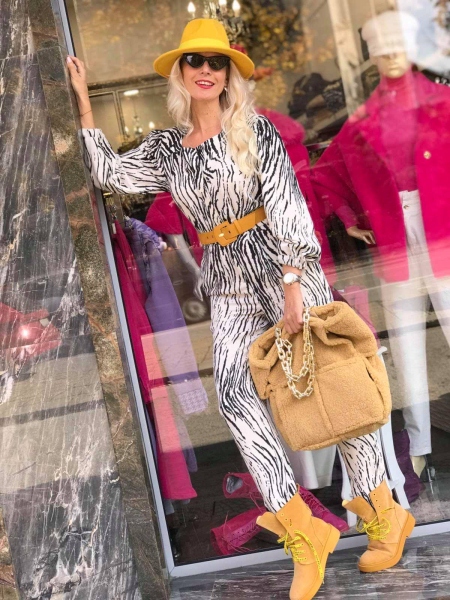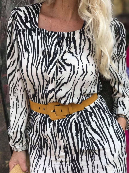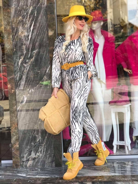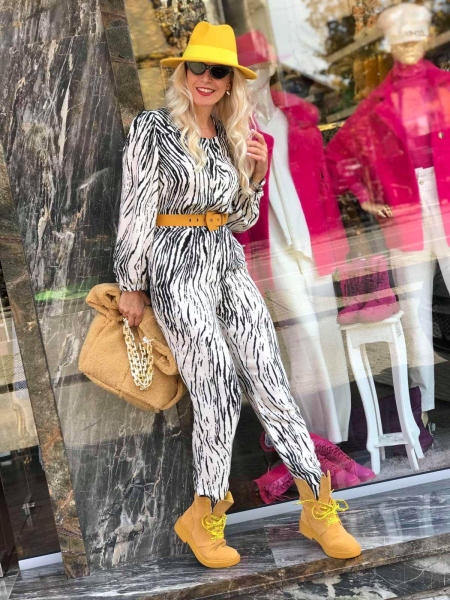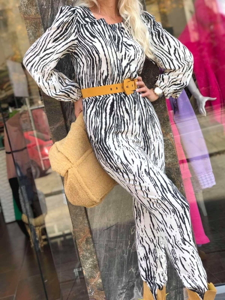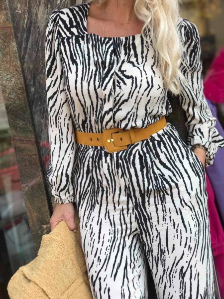 Гащеризон от тънка материя в цвят екрю с десен Зебра. Моделът е с висока талия и има ластик в задната част. Към гащеризонът има и колан в жълто.