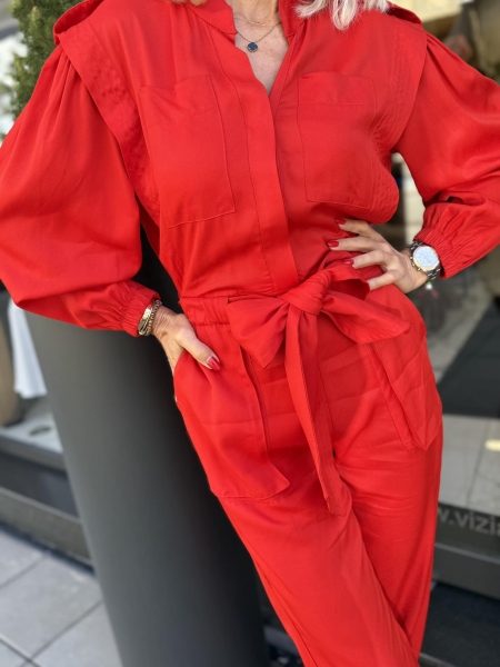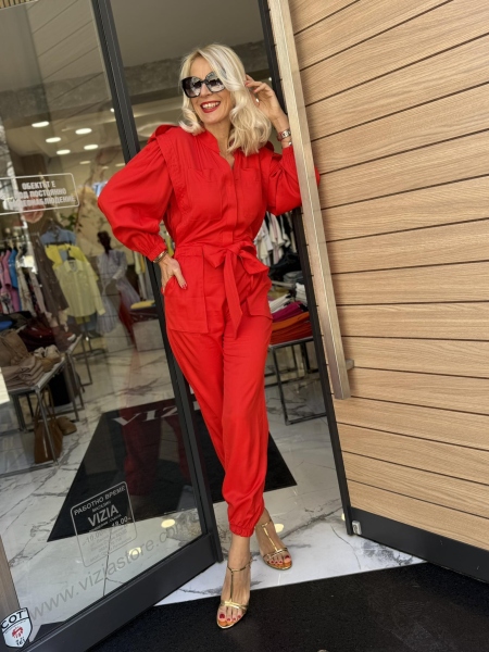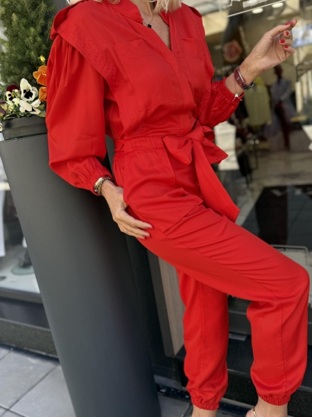 Гащеризон от тънка матеврия в наситено червен цвят. Моделът е с ластик в талията и в краищатана на крачолите. Към него има и текстилен колан.