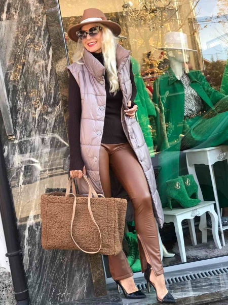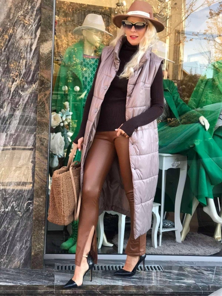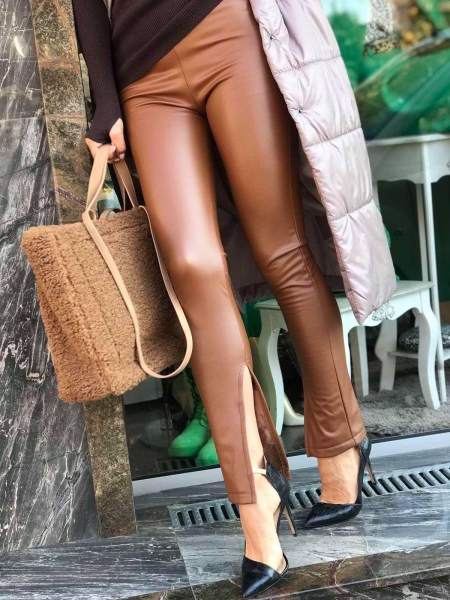 Клин от еко кожа в кафяв цвят. Моделът е с ластик в талията и в краищата на крачолите е с цепки. Материята е еластична и от вътрешната част е подплатена.