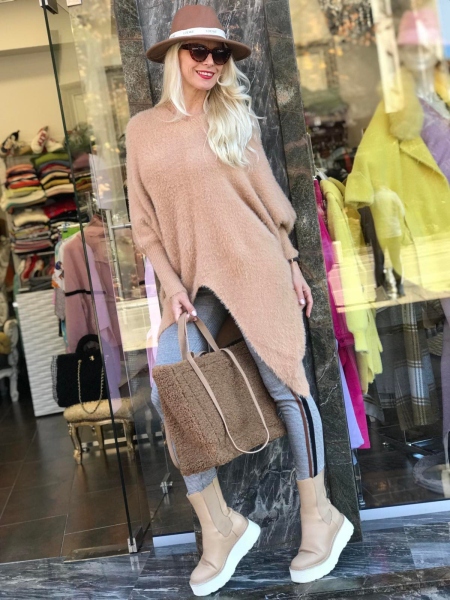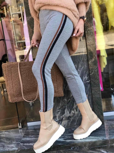 Панталон по тялото от еластична материя с пипитен десен. Моделът е с ластик в талията.