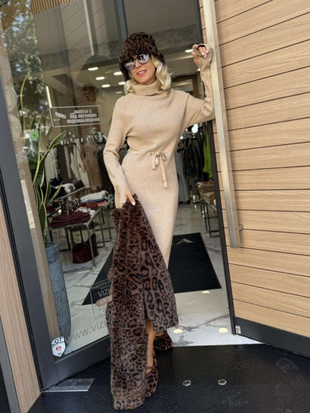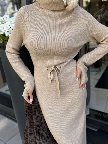 Рокля в бежов цвят от фино плетиво. Моделът е със свободен силует и поло яка. Размерът е универсален и е подходящ за M, L.