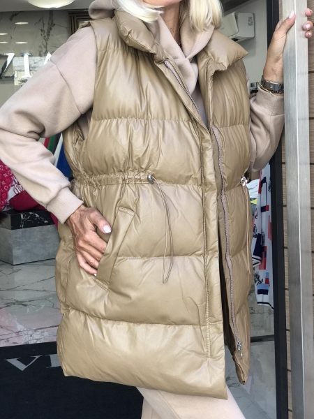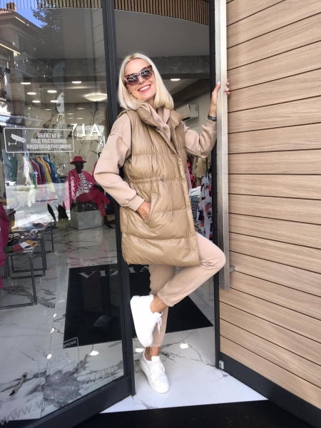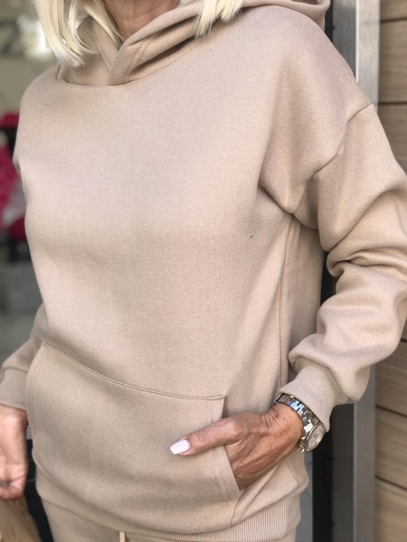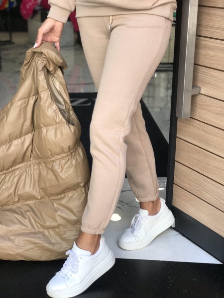 Ежедневен комплект в бежов цвят от трикотажна материя. Елекът е от еко кожа и е със свободен силует. Суичерът е със свободен силует без закопчаване. Долнището е с ластик в талията и прави крачоли.
