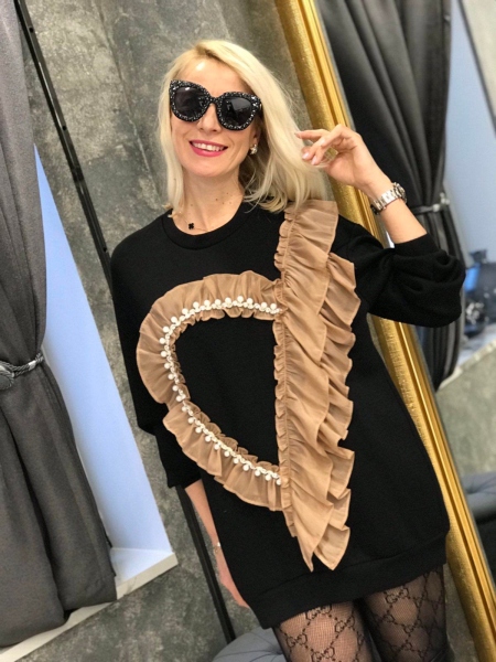 Блуза в черно от трикотажна материя. Моделът е със свободен силует и в предната си част е с декорация. Моделът е универсален размер и е подходящ за M, L.
