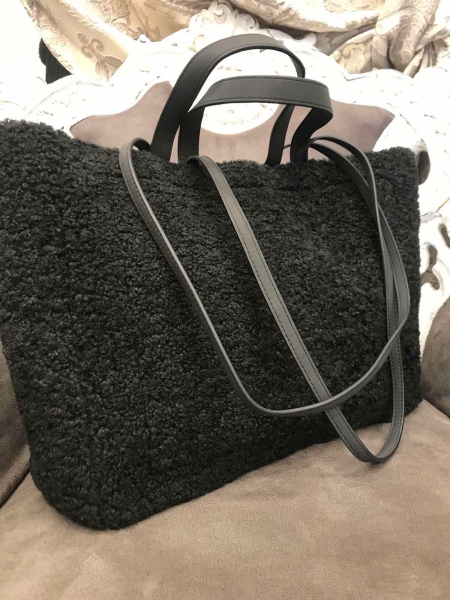 Чанта от агнешка вълна в черен цвят с къси и дълги дръжки. Моделът е без прегради и се закопчава с едно копче.