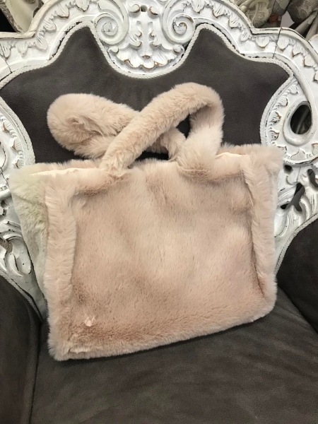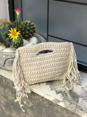 Чанта в бежов цвят от мека и пухкава материя с къси дръжки. Моделът е без прегради и се закопчава с едно копче.