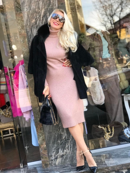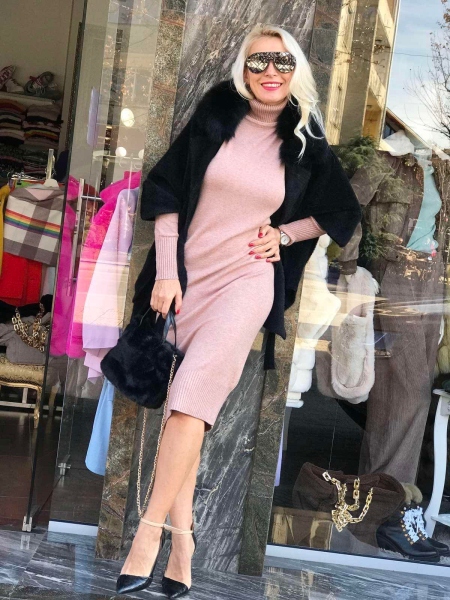 Рокля с поло яка в цвят пудра. Моделът е със свободен силует. Размерът е универсален и е подходящ за М, L.