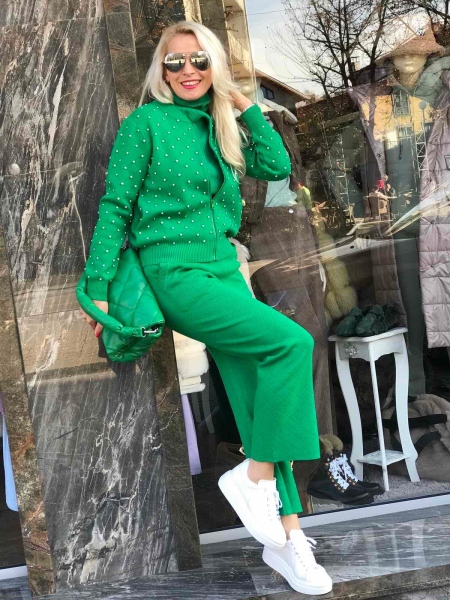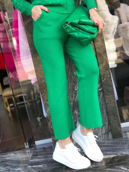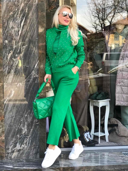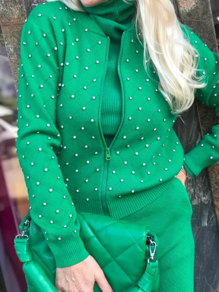 Комплект в зелен цвят от фино плетиво. Горната част е тип жилетка с цип и е декорирана с камъчета. Панталонът е с ластик в талията и разкроени крачоли.