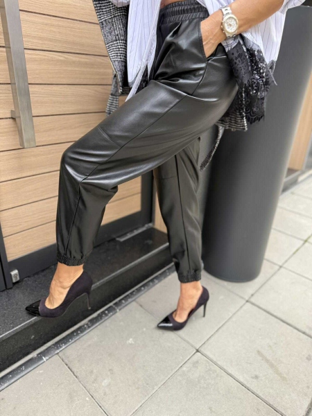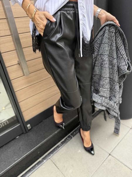 Панталон от еко кожа в черен цвят. Моделът е с ластик в талията и края на крачолите.