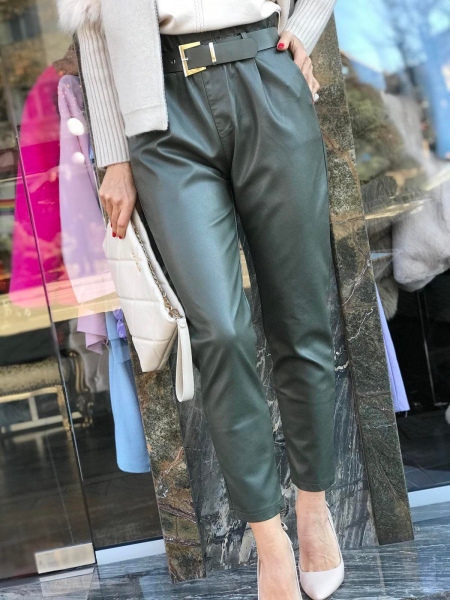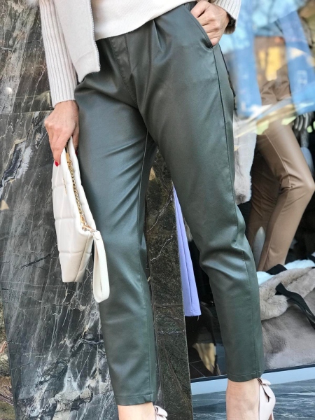 Панталон от еко кожа в маслено зелен цвят. Моделът е с ластик в талията.