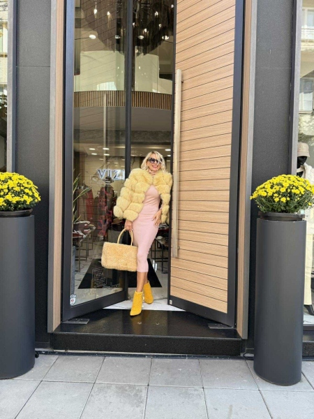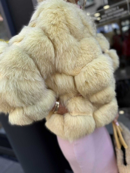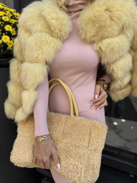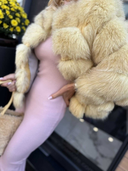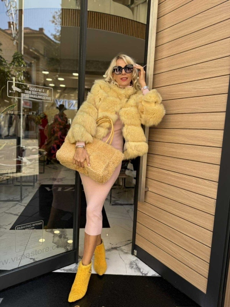 Късо палто от естествен косъм в светло жълт цвят. Моделът е със свободен силует.