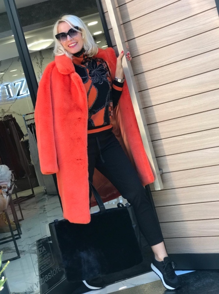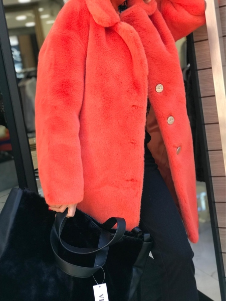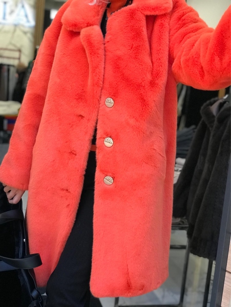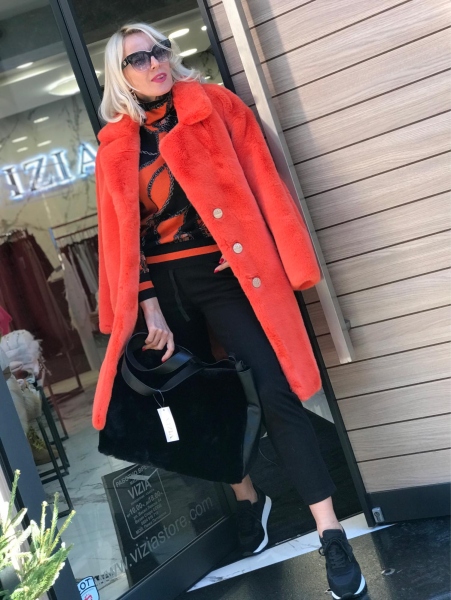 Дълго палто от мека и топла материя в оранжев цвят. Моделът е със свободен силует и се закопчава с копчета. Размерът е универсален и е подходящ за M, L.