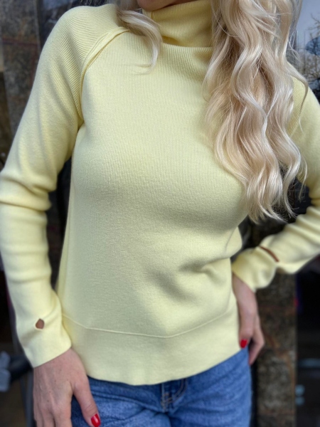 Поло блуза в жълт цвят от мека кашмирена материя. Моделът е с дълъг ръкав и има отвор за палеца.